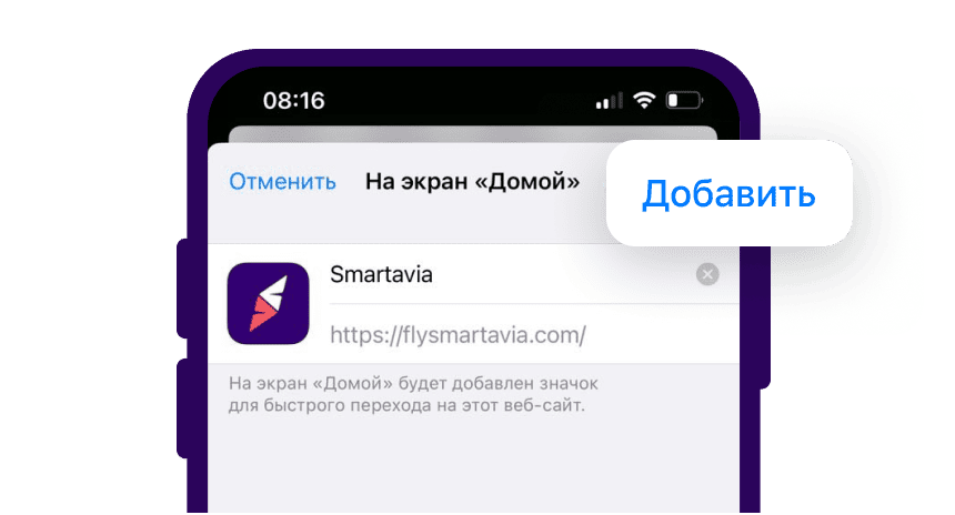 - Tap "Add" in the top right corner of the screen. The Smartavia icon will appear on your home screen